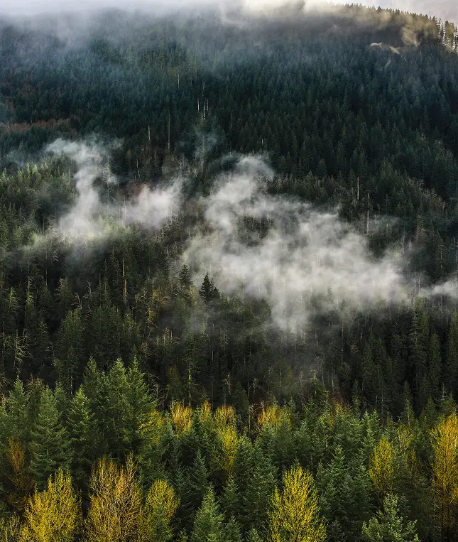Meža skats no putna lidojuma, biezas miglas laikā.